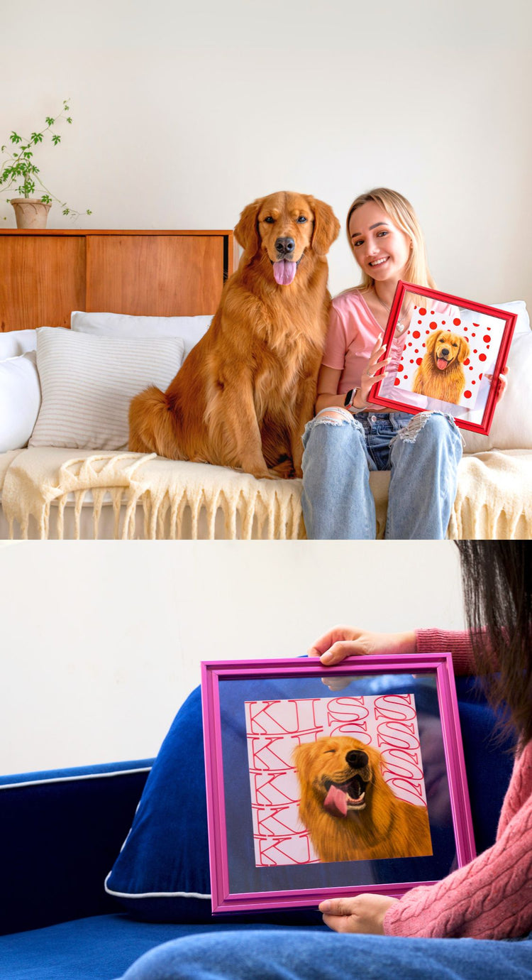 Upload a clear photo of your pet. Select your background style, frame, and size to make it uniquely yours!